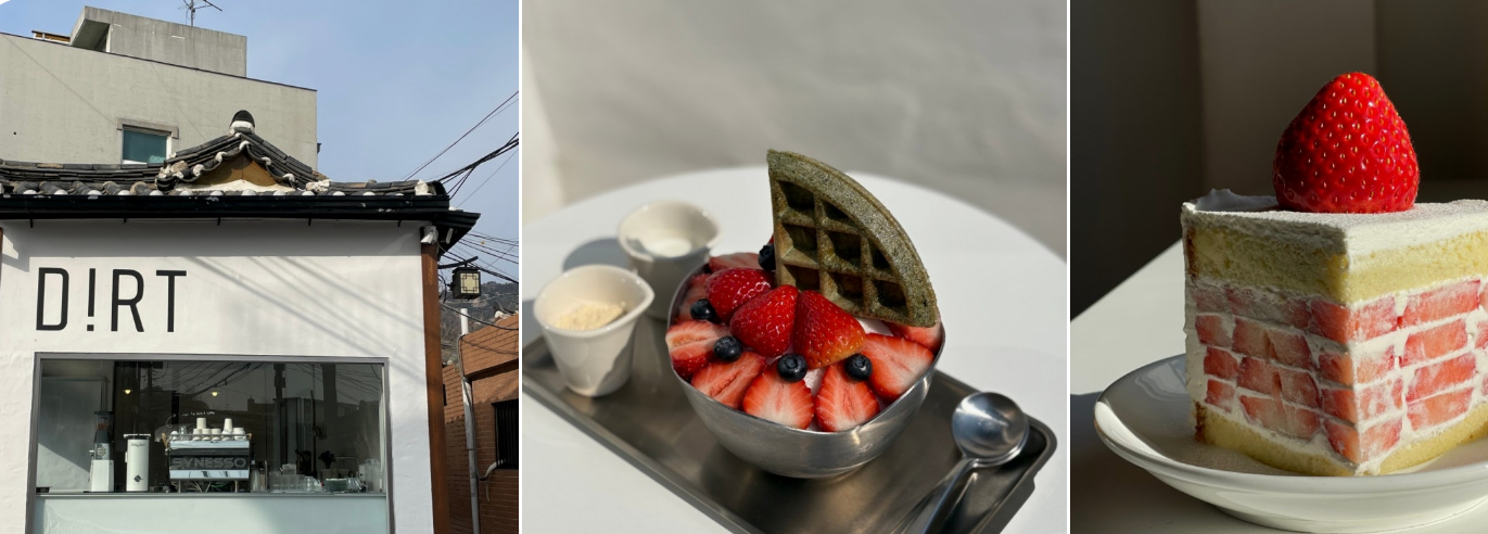 딸기 디저트 카페로도 유명한 더트커피는 딸기가 층층이 쌓여있어 정말 맛있어서 친구들과 담소 나누기 좋은 곳이에요. 또한 애견인들에게도 너무 좋은 반려견 동반도 가능하답니다.