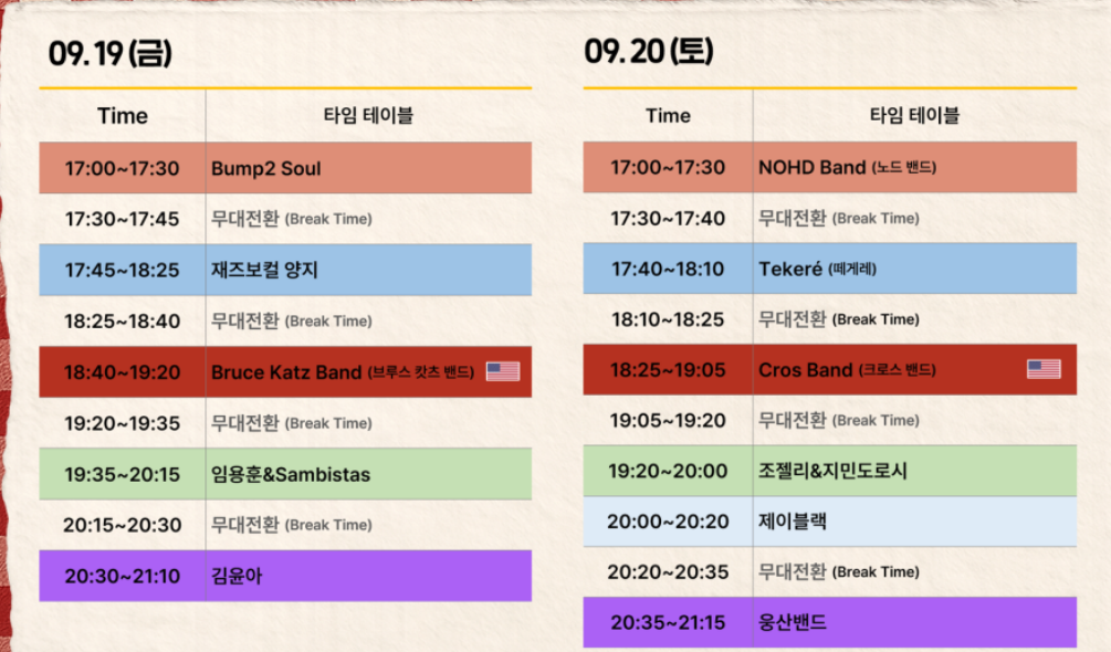 - 편안한 복장 : 야외에서 열리는 만큼 편안한 복장을 추천해요. 특히, 9월 이어도 더울 수 있기에 시원한 옷을 챙기는 것이 좋겠죠.