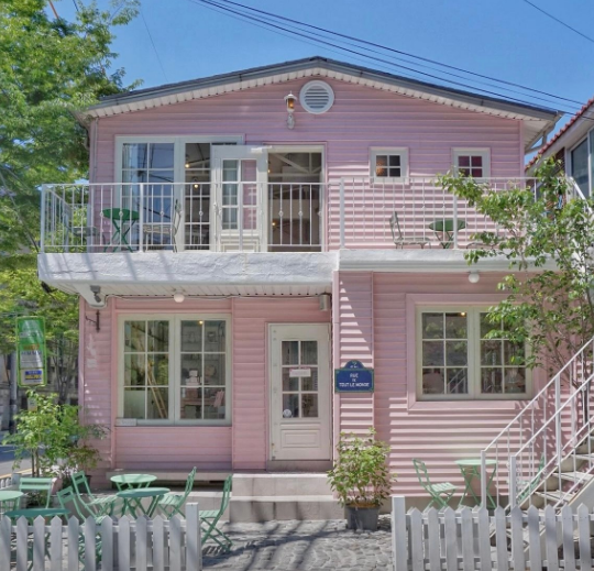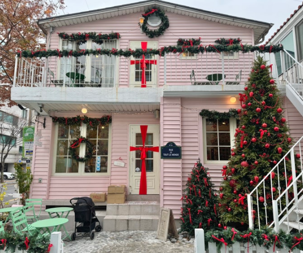 카페의 외관은 핑크색으로 꾸며져 있어 눈에 띄어요. 대형 리본과 크리스마스 장식이 더해져 마치 크리스마스 선물 같은 느낌을 주죠. 내부는 아늑하고 따뜻한 분위기로, 친구들과의 수다나 데이트 장소로 안성맞춤이에요. 조명도 은은하게 비추어져 있어, 사진 찍기에도 정말 좋아요.